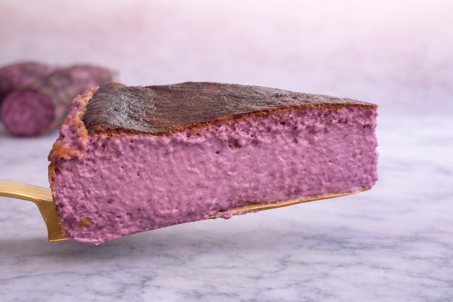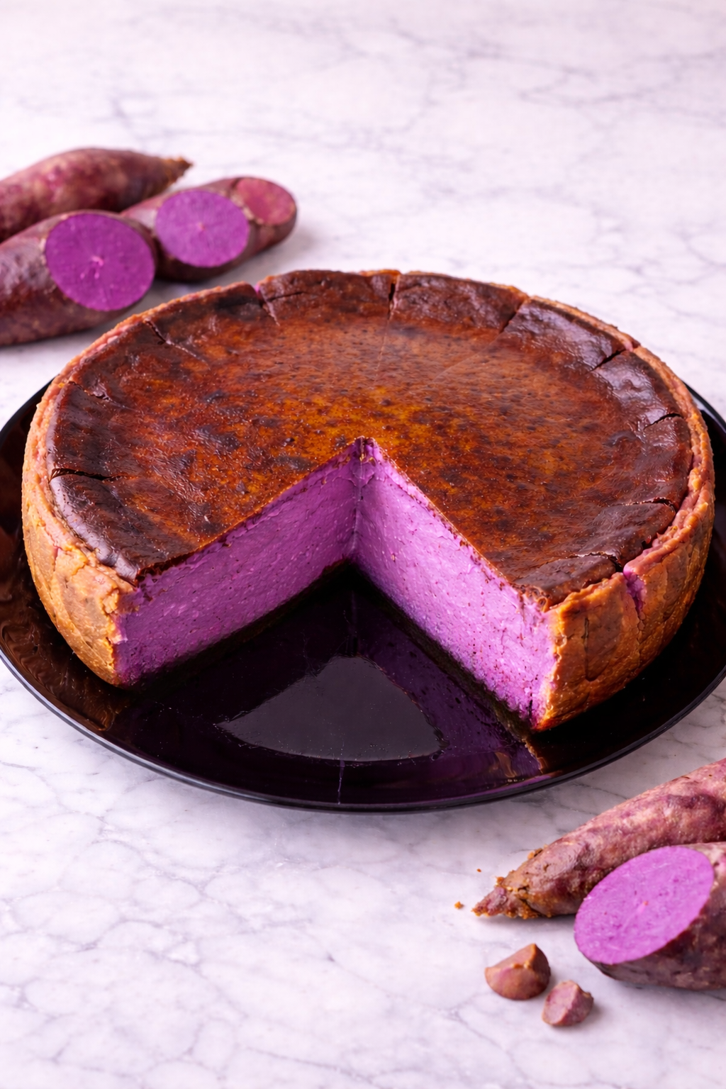 Cheesecake basco de forno, sem base de bolacha, com interior cremoso e superfície tostada característica do estilo San Sebastián. Elaborado com ube de origem filipina, responsável pela sua cor roxa natural e sabor delicadamente adocicado. Produzido artesanalmente com ingredientes de alta qualidade. Ideal para partilhar.